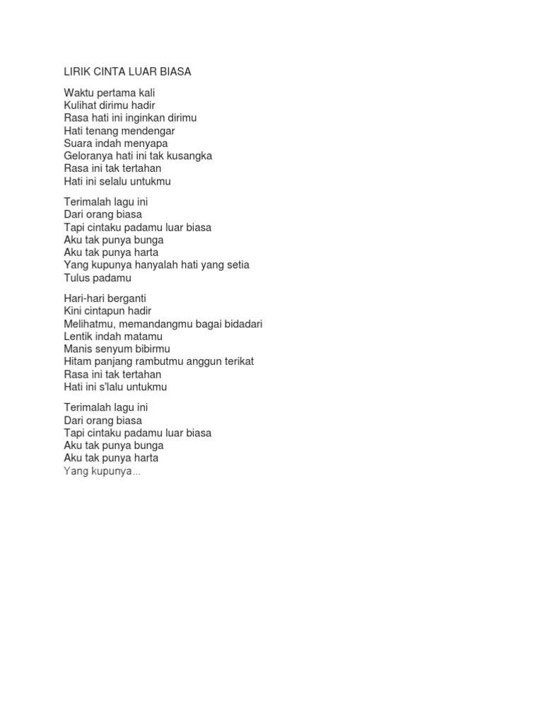 Tapi cintaku padamu luar biasa. Tapi cintaku padamu luar biasa. Waktu pertama kali ku lihat dirimu hadir. Terimalah lagu ini dari orang biasa tapi cintaku padamu luar biasa aku tak punya bunga, aku tak punya harta yang ku punya hanyalah hati yang . Yang kupunya hanyalah hati yang setia tulus padamu. Hati ini selalu untukmu terimalah lagu ini dari orang biasa tapi cintaku padamu luar biasa aku tak punya bunga aku tak punya harta yang ku punya hanyalah Tapi cintaku padamu luar biasa. Terimalah lagu ini dari orang biasa.